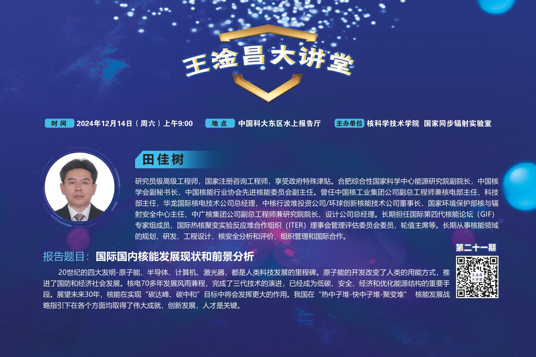 王淦昌大讲堂”为核科学技术学院、国家同步辐射实验室主办的系列报告会,本次大讲堂特邀合肥综合性国家科学中心能源研究院副院长,中国核学会副秘书长,中国核能行业协会先进核能委员会副主任田佳树研究员级高级工程师来我校做报告。